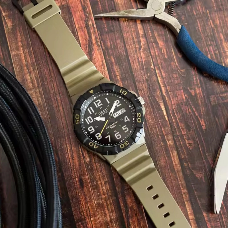 قاب و بند هر دو از رزین تقویتشده ساخته شدهاند؛ متریالی که ضدضربه، فوقالعاده سبک و بسیار راحت روی مچ است. رنگ بند مشکی مات با صفحه قهوهای و جزئیات کرمرنگ، ظاهری نظامی (Military Style) ایجاد میکند.