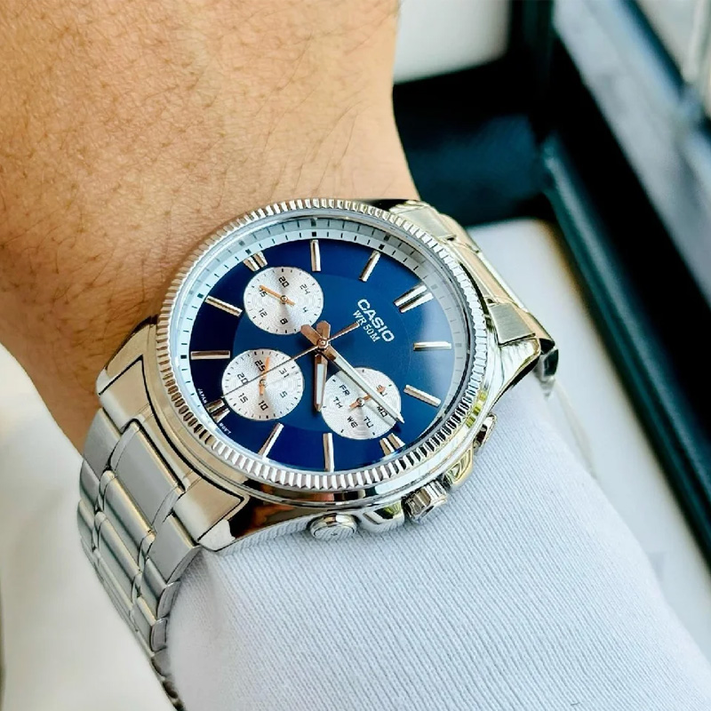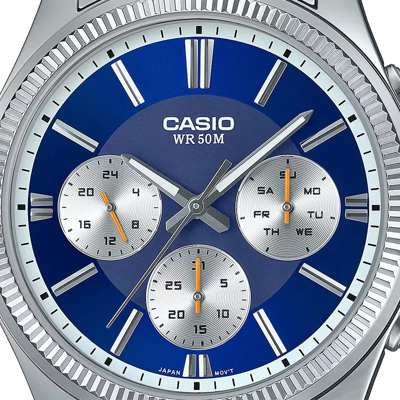 Casio MTP1375D-2A1V Men's Stainless Steel Fluted Bezel Multifunction Blue Dial Watch