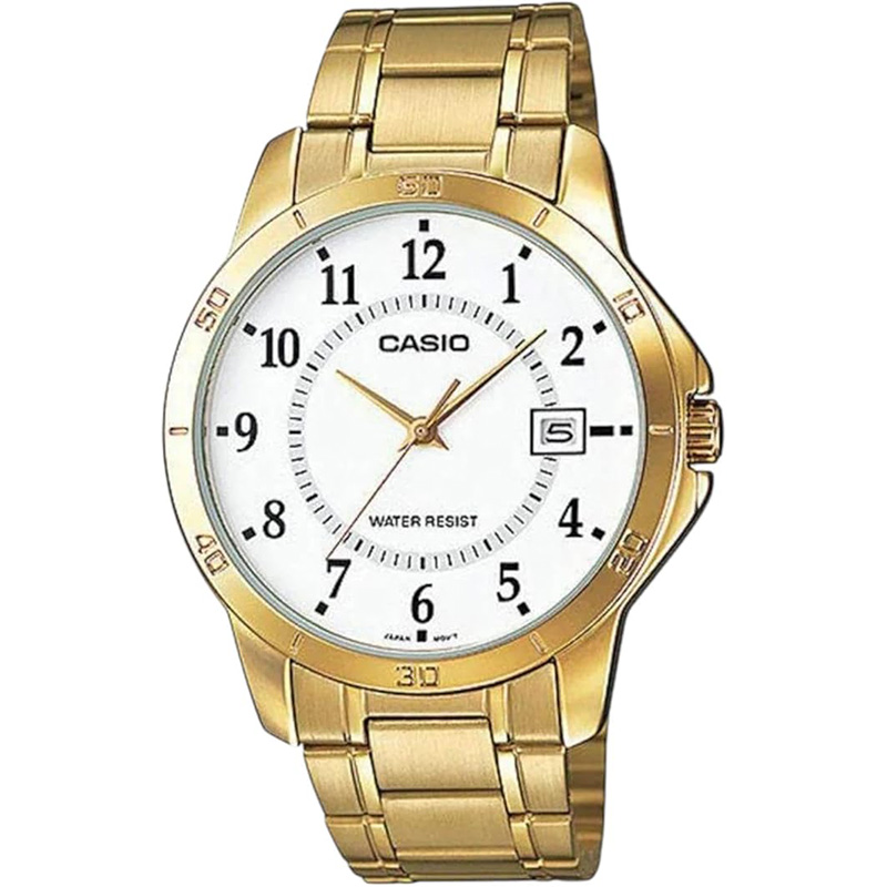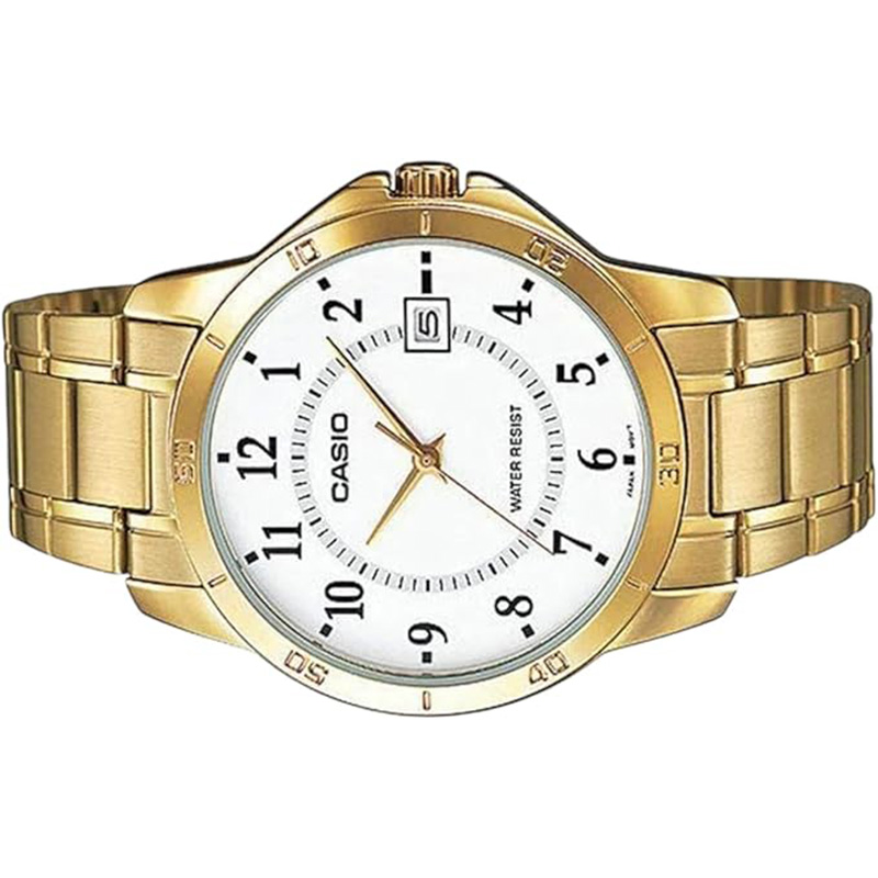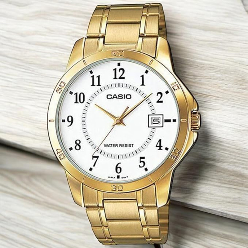 بدنه و بند Casio MTP-V004G-7B از استیل ضدزنگ طلایی با پرداخت آیینهای ساخته شده است. رنگ طلایی عمیق آن در نور طبیعی، درخشش خاصی دارد که بیانگر سلیقهی ظریف و درک از زیبایی است. بند با قفل تاشو ایمن طراحی شده تا راحتی و امنیت استفاده را حفظ کند. صفحهی سفید با لوگوی ظریف Casio در موقعیت بالا و پنجرهی تاریخ در ساعت ۳، هماهنگی چشمنوازی دارد.
