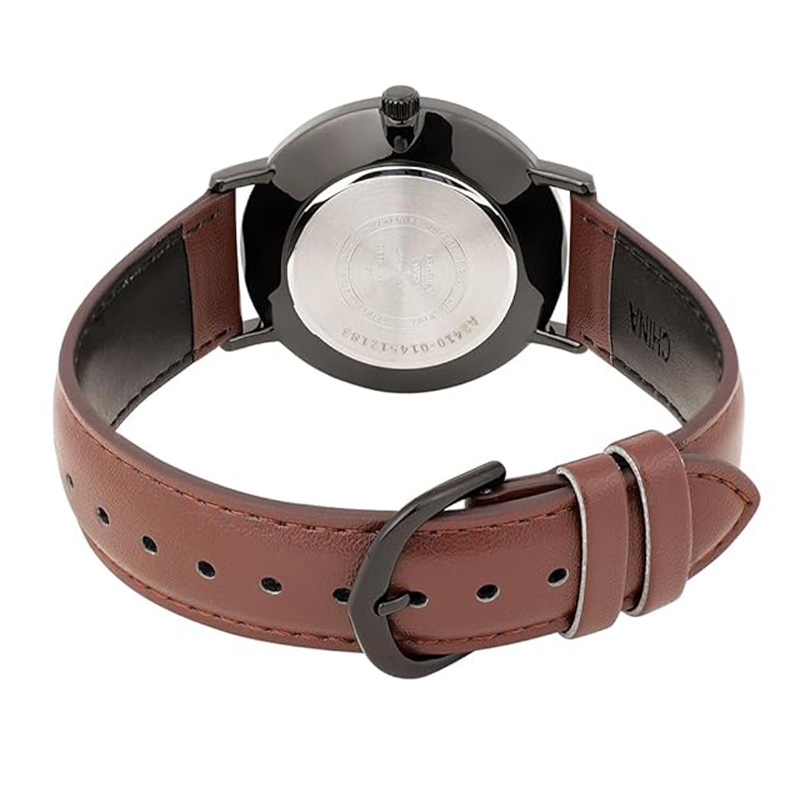 بند چرمی مشکی از نوع Synthetic Leather با بافت نرم و انعطافپذیر است. دوختهای ظریف کناری و سگک فلزی استیل، حس یک محصول رسمی و کلاسیک را منتقل میکنند. وزن ساعت بسیار سبک است و در استفاده طولانیمدت هیچ فشاری روی مچ ایجاد نمیکند.