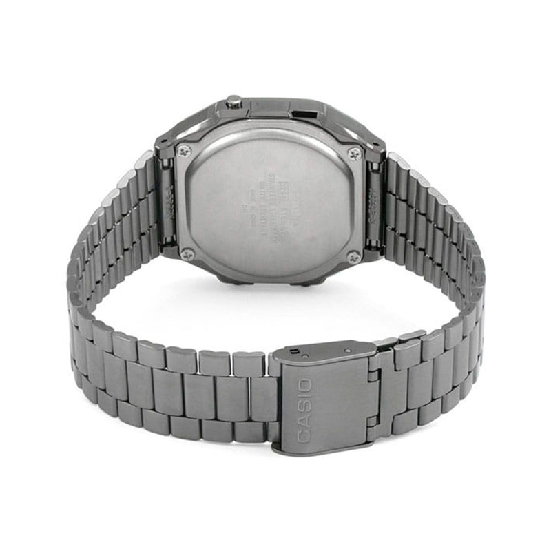 بدنه و بند ساعت از استیل ضدزنگ با آبکاری Gunmetal ساخته شدهاند؛ رنگی که ظاهری شیک، جذاب و کمی تیره ایجاد میکند. قاب طراحی کلاسیک مستطیلی Casio Vintage را حفظ کرده اما با رنگ تیره، حس لوکستری نسبت به نسخههای نقرهای ارائه میدهد.