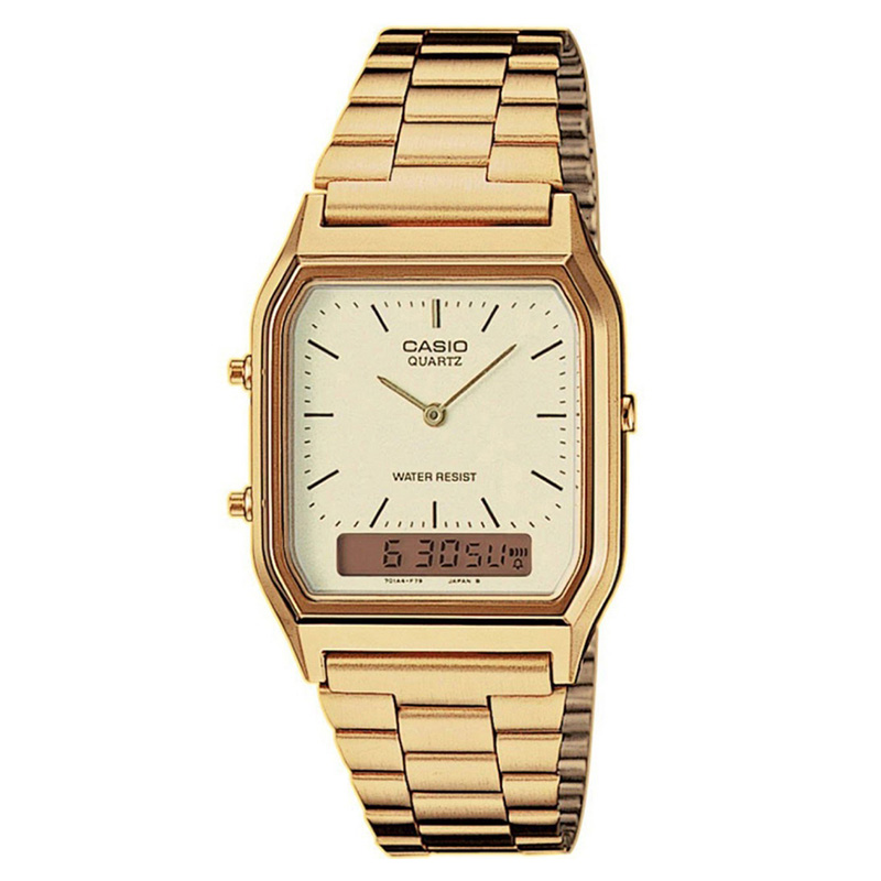 ساعت مچی کاسیو مدل CASIO-AQ-230GA-9D یکی از مشهورترین ساعت‌های هیبریدی کاسیو است که با ظاهر طلایی، سبک رترو و امکانات کاربردی، سال‌هاست میان طرفداران مد و ساعت‌های کلاسیک محبوب باقی مانده است.