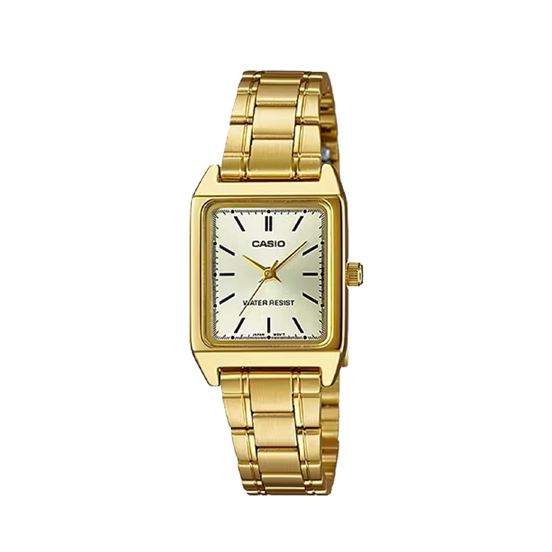 • ساعت زنانه Casio LTP‑V007G‑9E با طراحی کلاسیک و قاب مربعی.