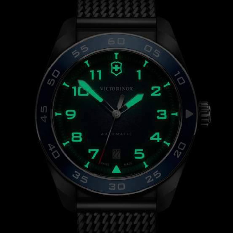 ویکتورینوکس با رنگ آبی متالیک صفحه، روح دریا و عمق آسمان را در طراحی بازسازی کرده است. نشانگرهای نقرهای و شبتاب، خوانایی کامل را در هر شرایط نوری فراهم میکنند. لوگوی سپر معروف سوئیس آرمِی در بالا قرار گرفته تا نماد اصالت ساعت باشد.